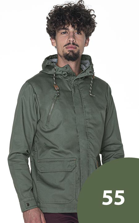 “Carter” – men’s spring and autumn hooded jacket; hood with contrastive oxford lining; water-repellent finish which prevents water from gathering on the fabric. Stand-up collar; twill fabric; molded main and pocket zipper; main zipper hidden under panel with press studs; double bottom pockets; inside lining made of taffeta. Small decorative leather elements; inside document pocket with velcro strap; decorative string to adjust the hood; inside welts on the bottom; bottom with zipper on the inside to enable marking machine access.